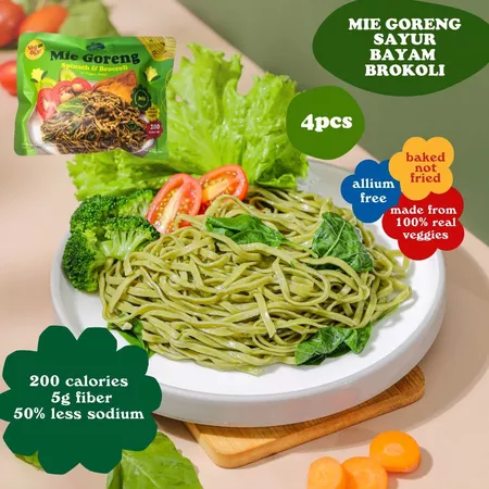 Mie goreng Bayam Brokoli. Informasi Produk – 200 Kalori – Allium free – Vegan – Vegetarian – Tinggi serat – Rendah Gluten – Tanpa MSG – Aman untuk bumil, penderita diabetes, kolestrol.